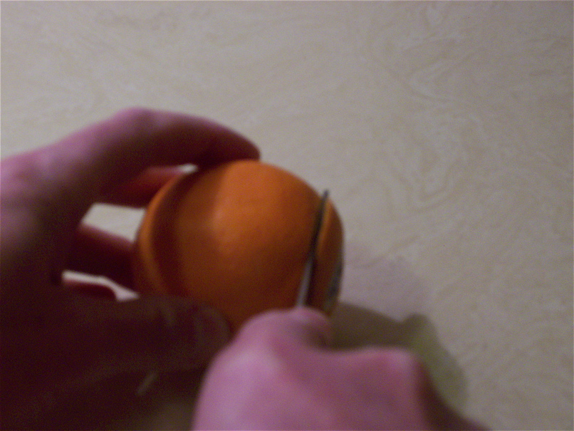 Cut into the peel from end to end. Repeat going around the orange, about 5 or 6 cuts. Don't cut too deep.