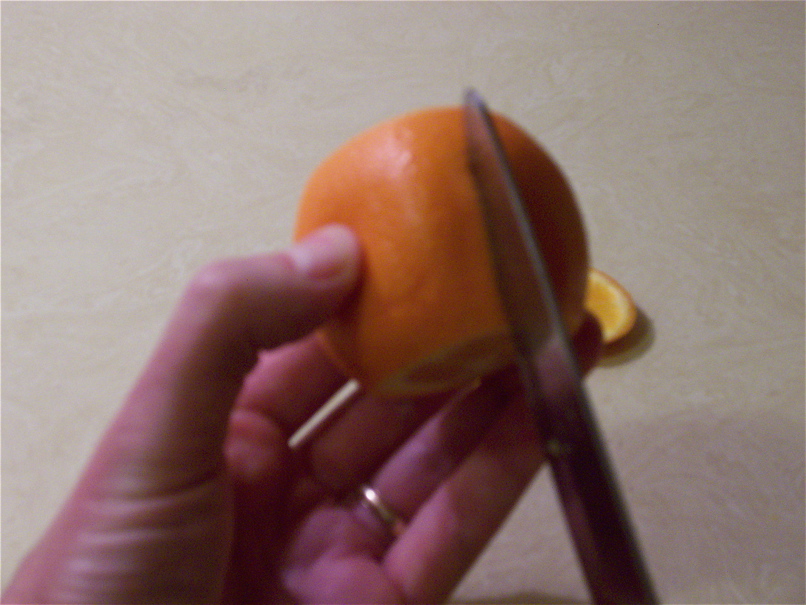 Cut both ends off the orange, taking care not to cut too far into the juicy bits.