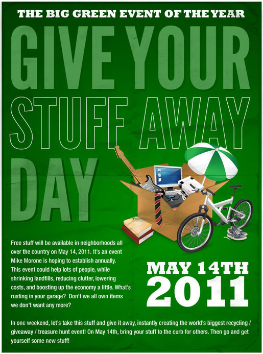 Let's face it - most of us have piles of stuff driving us crazy. One way to organize the mess is to give it away. In the name of purging, generosity, efficiency, and environmentalism, Mike Morone proposed an International Give Your Stuff Away Day on May 14th, 2011. Having attended several excellent 'Reuse Fairs', I have seen how effective such efforts can be.